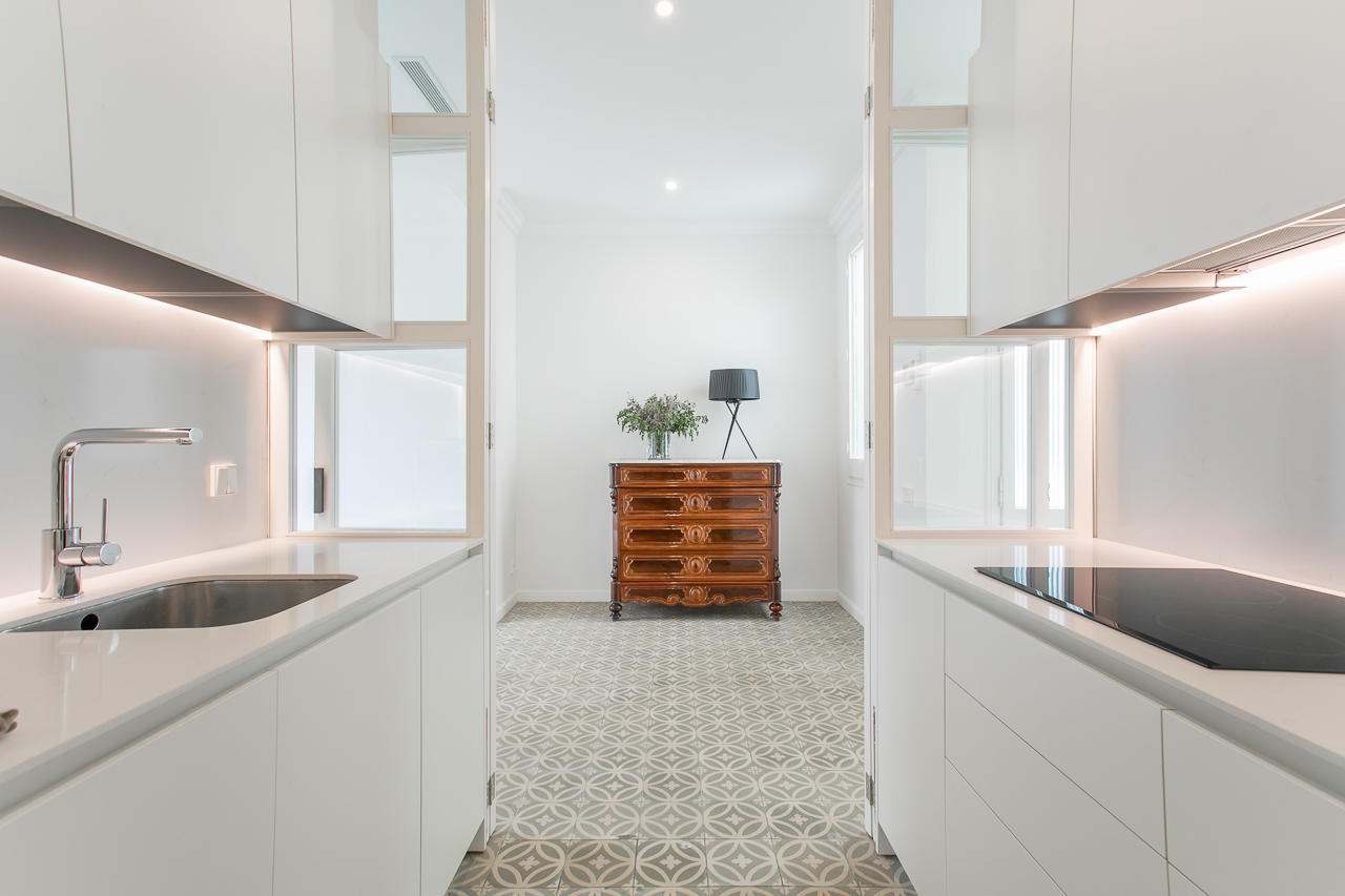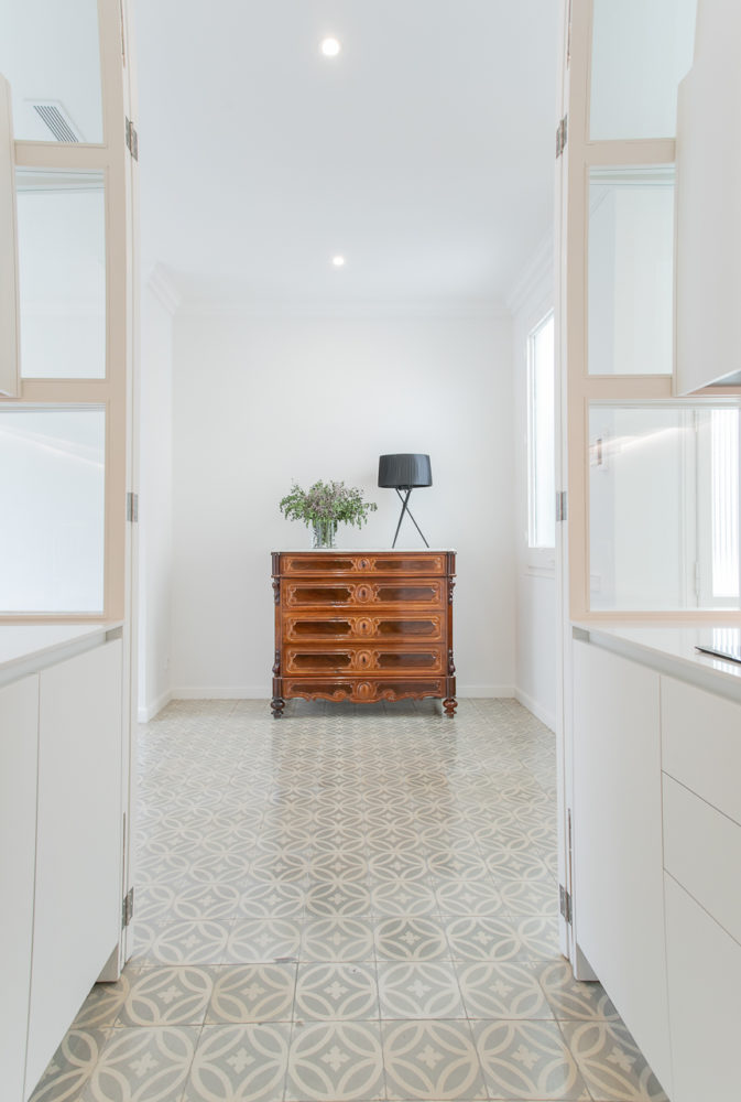 En este piso de 99 m2, ubicado en un edificio de 1920 situado en la Nova Esquerra de l´Eixample, se realizó una reforma integral, que ha permitido devolver a la vivienda su elegancia original. Una de las principales actuaciones que se llevaron a cabo fue la recuperación del suelo original, un pavimento hidráulico uniforme en toda la vivienda.