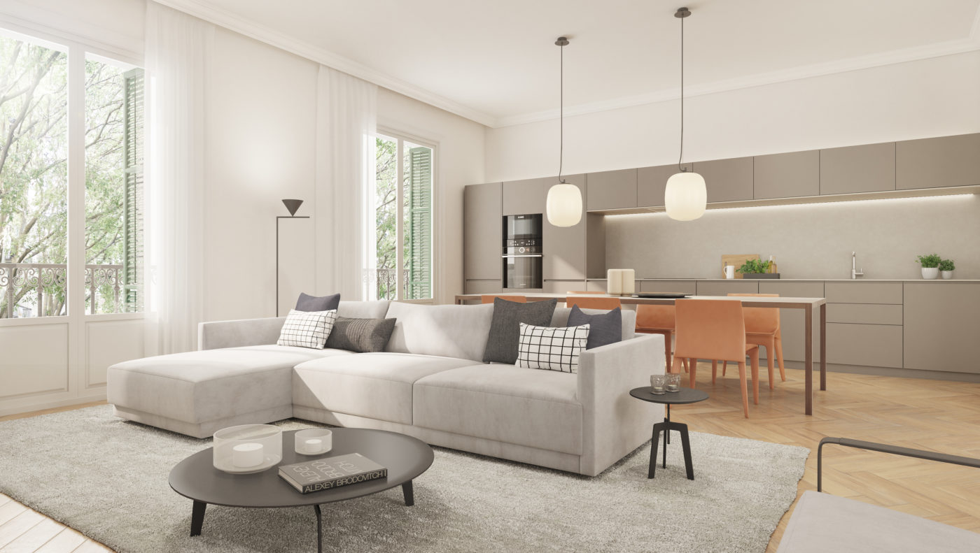 En la nueva distribución, el salon-comedor-cocina tienen protagonismo gracias a la entrada de luz de unos anchos ventanales. Espacio y luz son las dos premisas de este proyecto.