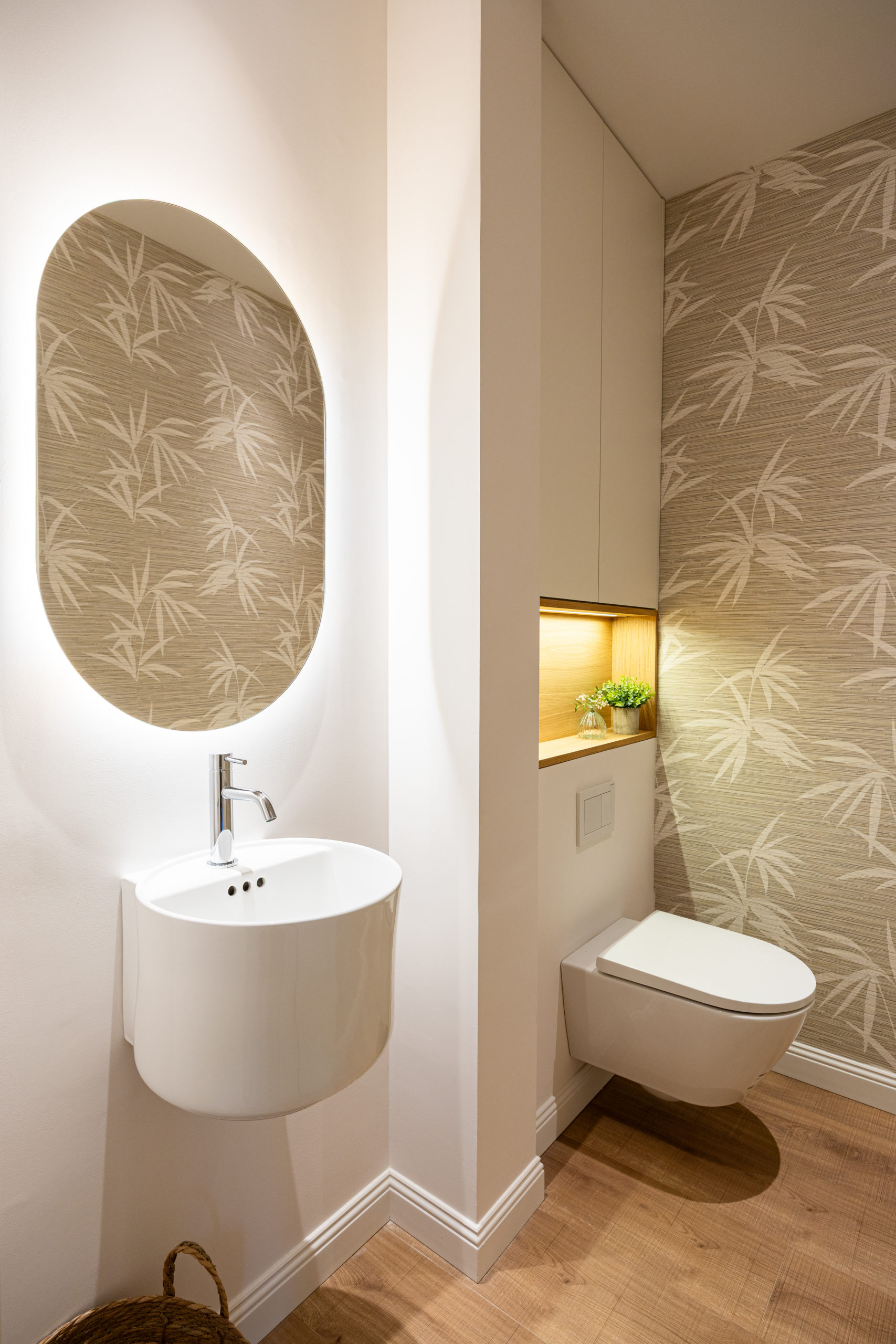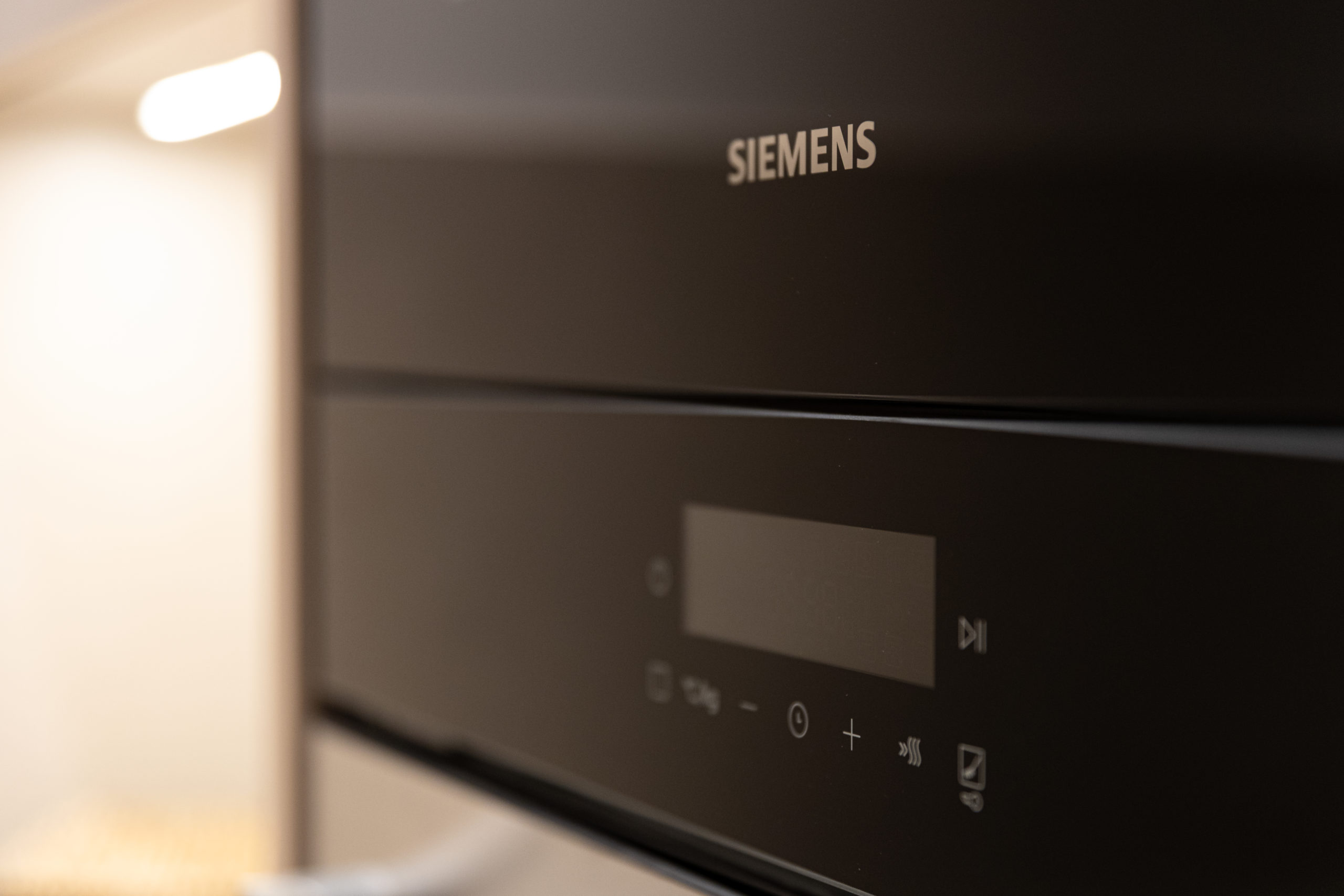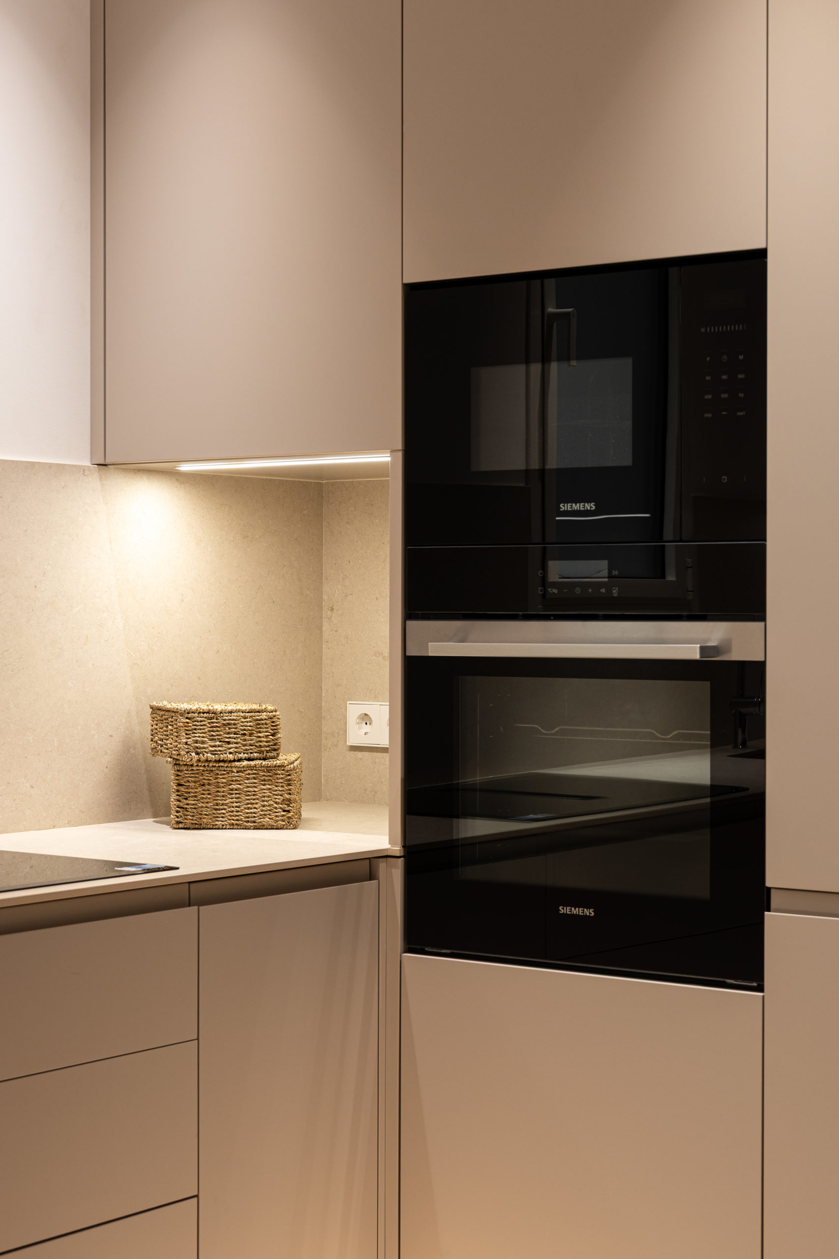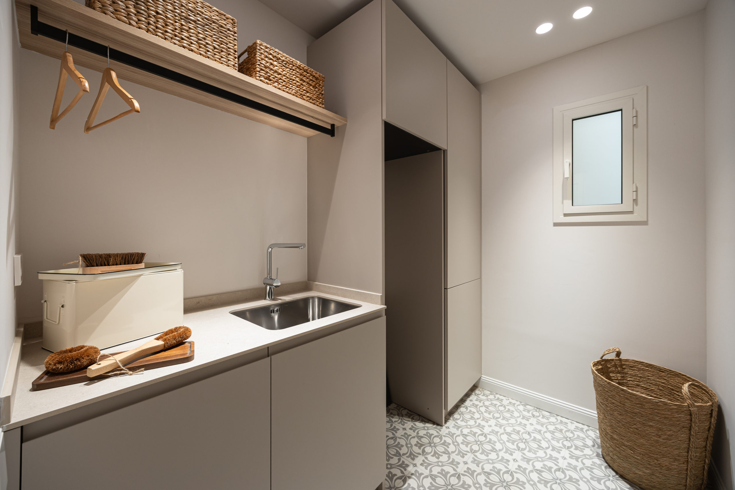 La cocina con elegantes puertas de hierro y cristal, permiten abrir o cerrar la estancia según las necesidades del momento, brindando un equilibrio perfecto entre integración y privacidad. Esta se entrega completamente equipada con electrodomésticos de alta gama de la marca Miele. Cuenta, además el piso, con una generosa zona de lavadero separada y un aseo de cortesía.