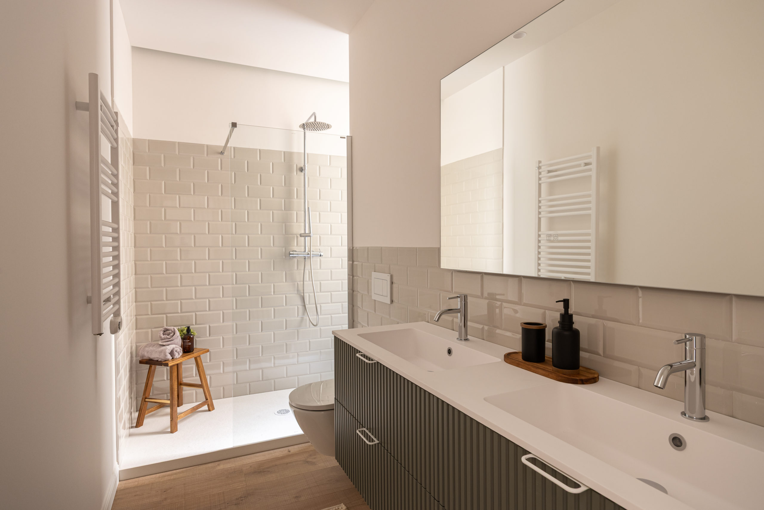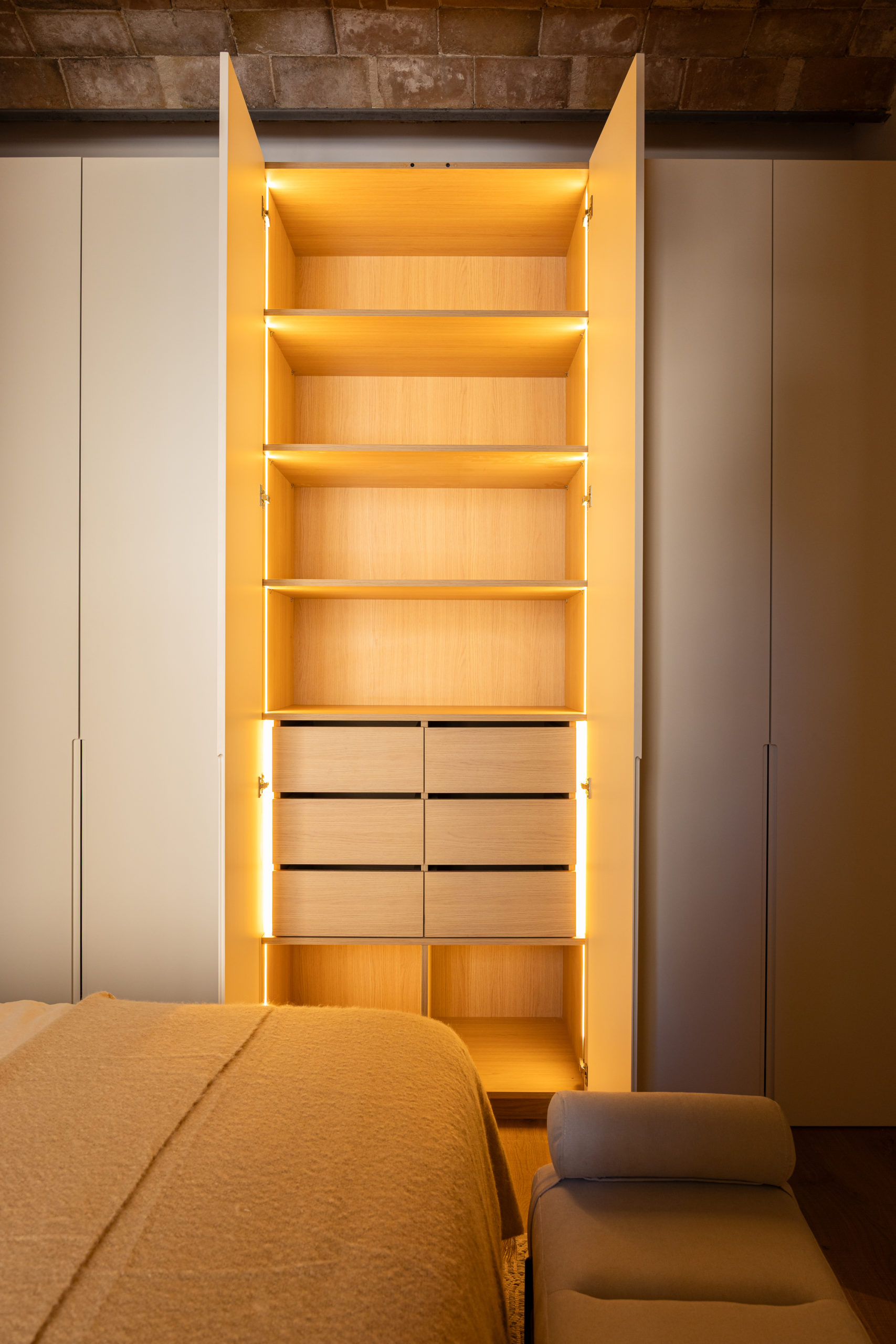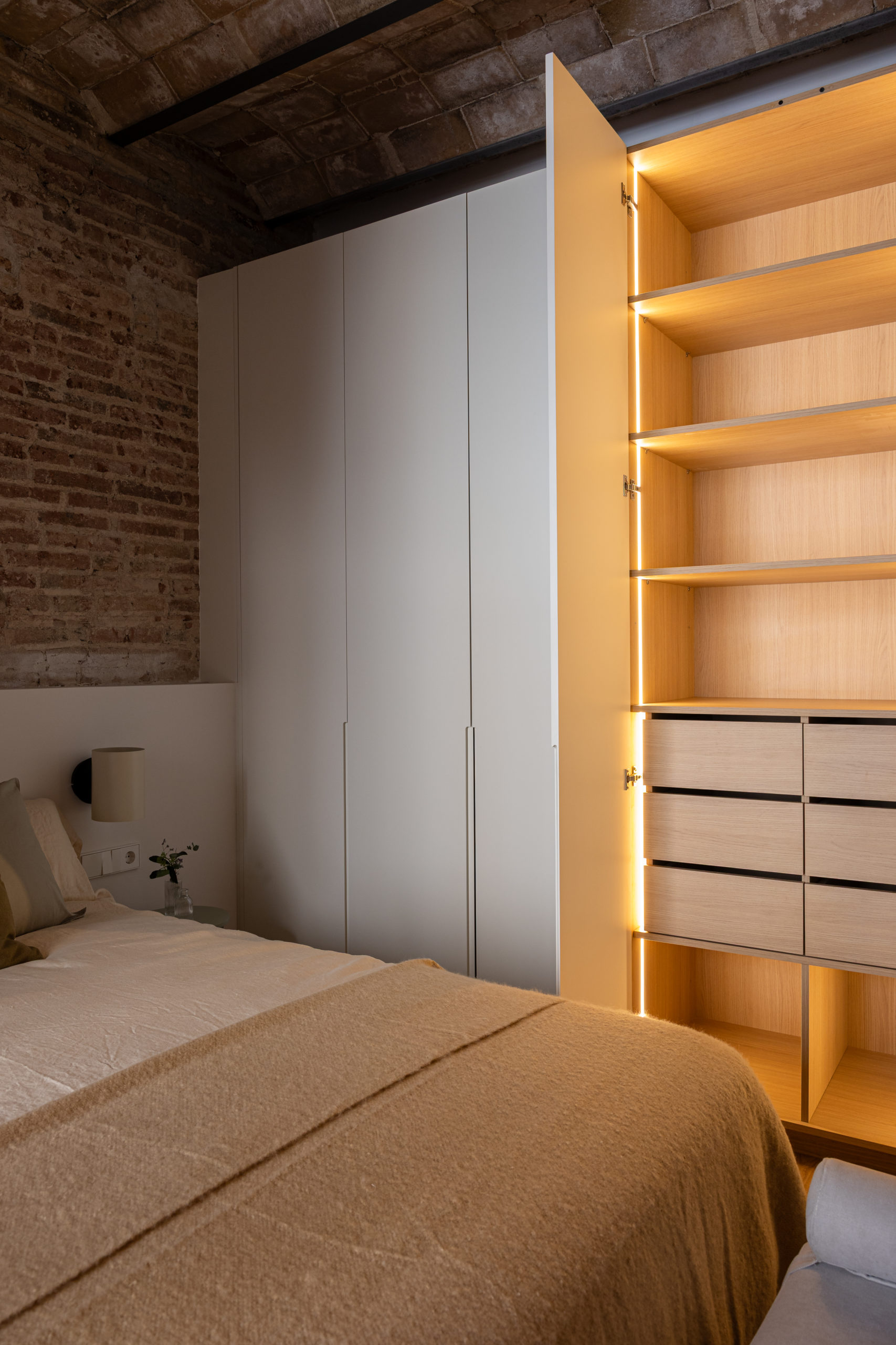 En la zona de noche, 2 dormitorios dobles, los dos tipos suite con baño, ofrecen el máximo confort, disfrutando los dos de salida al exterior, con un balcón y una acogedora galería, respectivamente, que facilitan la entrada de luz natural. En ambos se ha recuperado la pared de ladrillo visto creando originales y estilosos cabeceros, cuidadosamente diseñados. Una de las suites cuenta además con vestidor, mientras que la otra dispone de un gran armario de máxima capacidad hecho a medida.