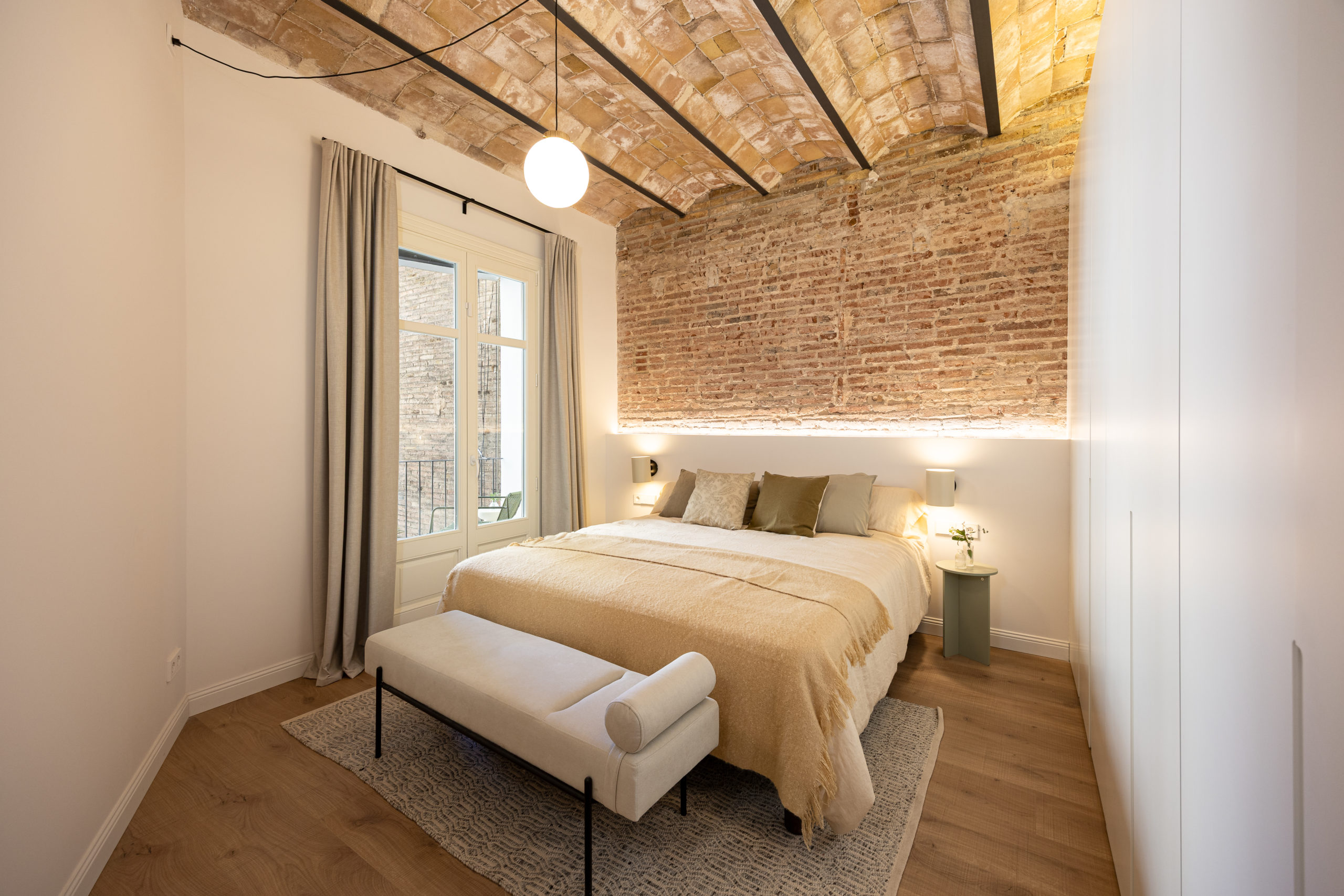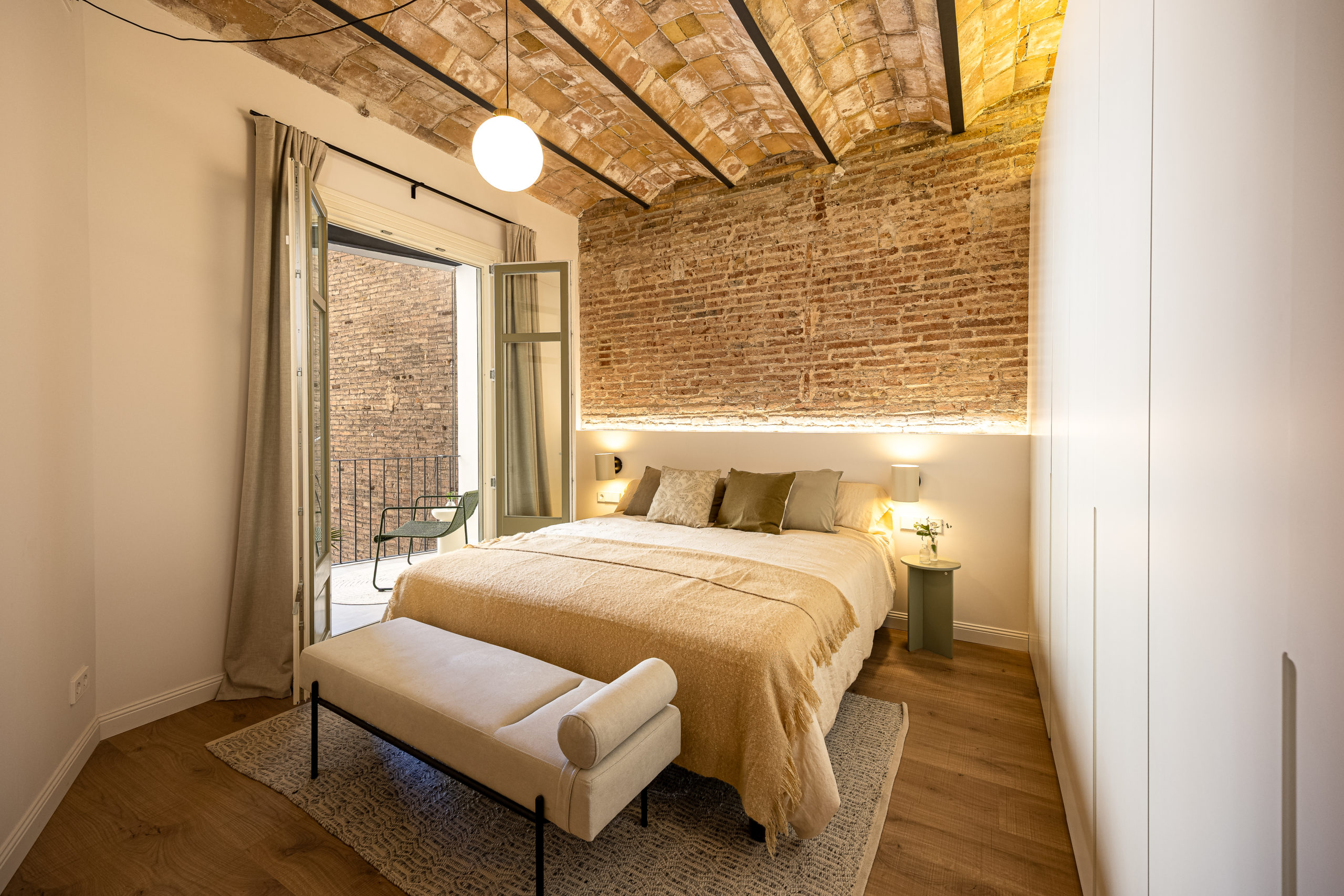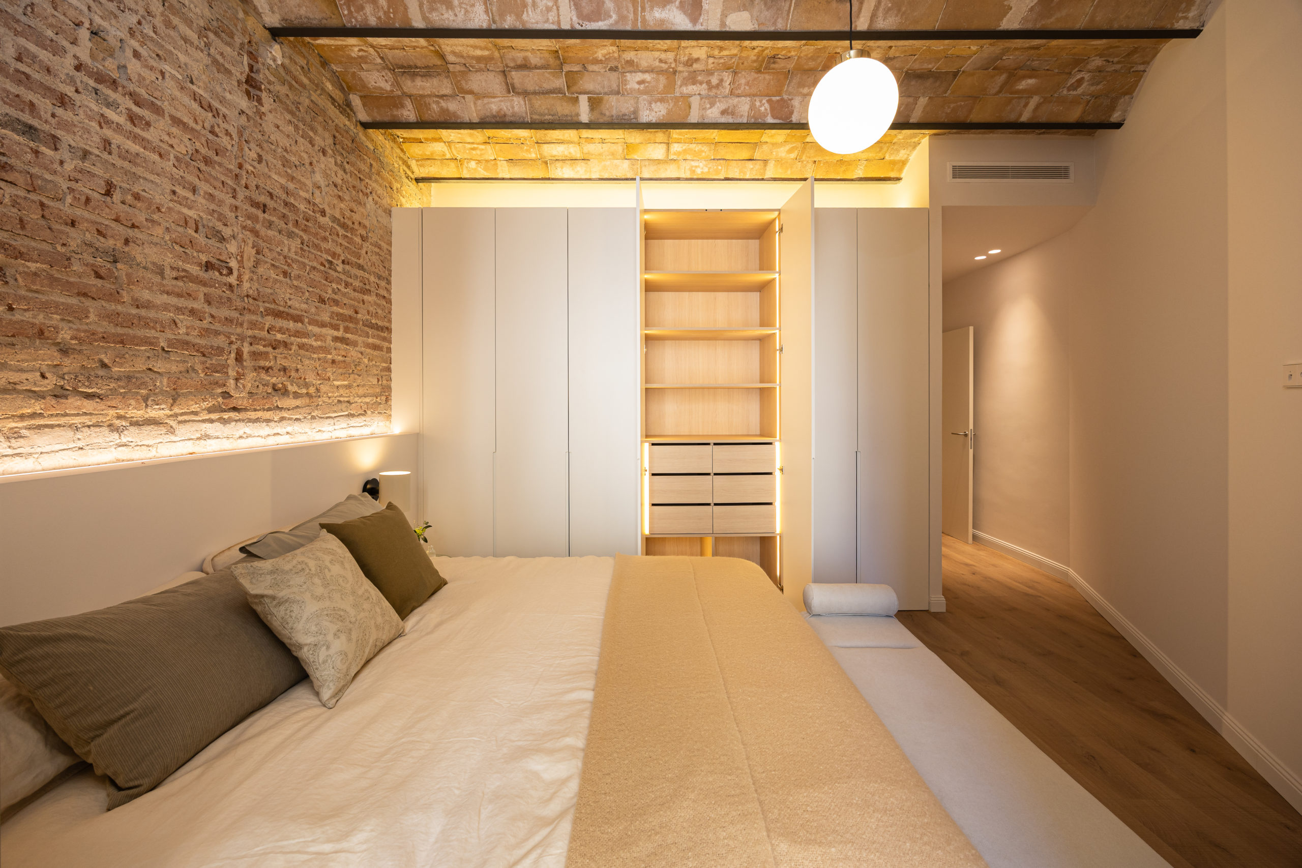 El corazón de la vivienda lo forma un generoso salón-comedor que ha respetado y recuperado la volta catalana y una pared de ladrillo visto, y dónde la luz natural inunda el espacio al entrar a raudales por los dos balcones exteriores.