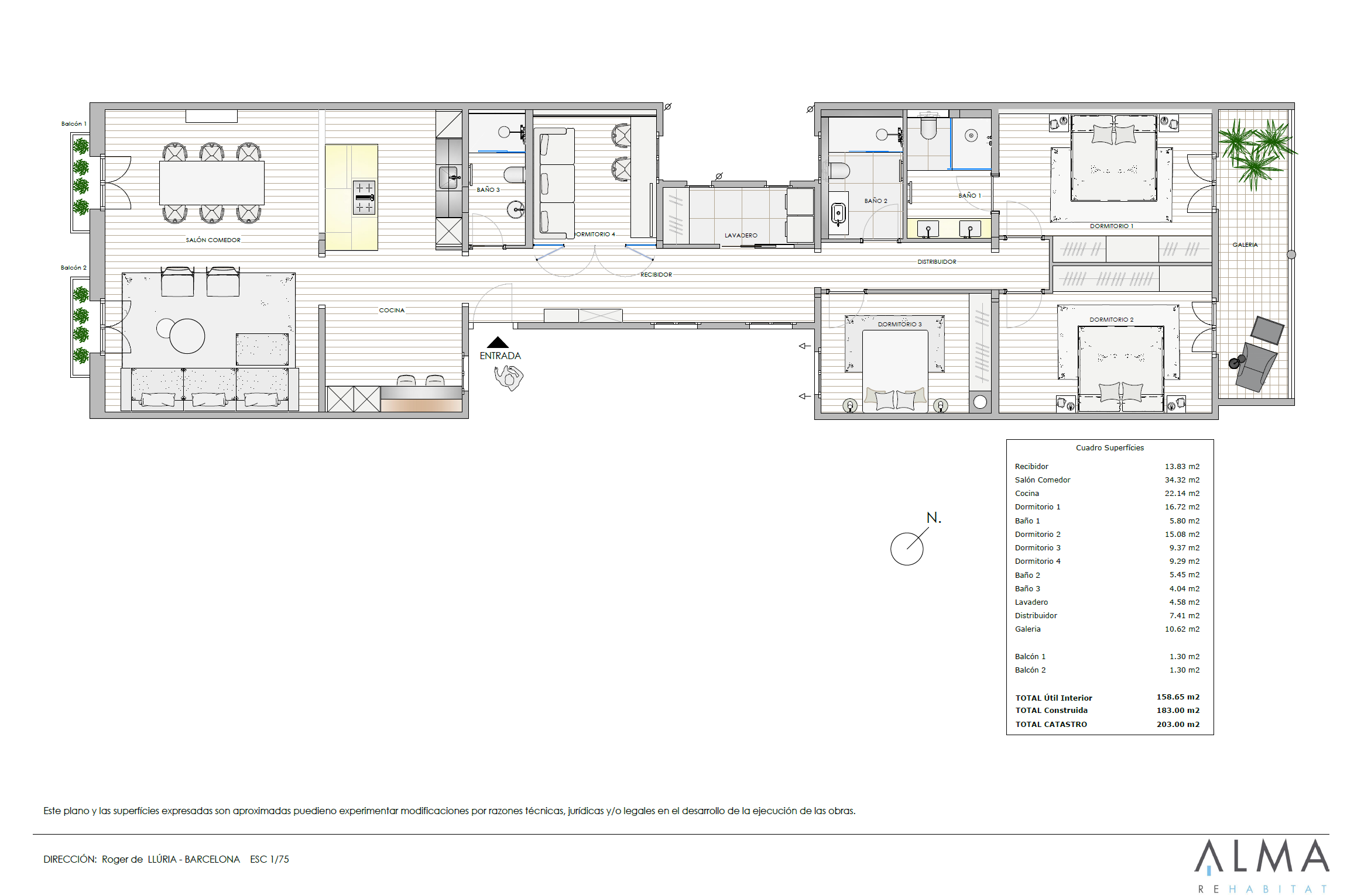 Esta vivienda rehabilitada combina la esencia de la arquitectura clásica barcelonesa con el confort contemporáneo, conservando los elementos originales que le confieren un carácter histórico único. Con una superficie de 203 m², el piso presenta una distribución moderna y funcional, separando de forma natural la zona de día y la de noche.